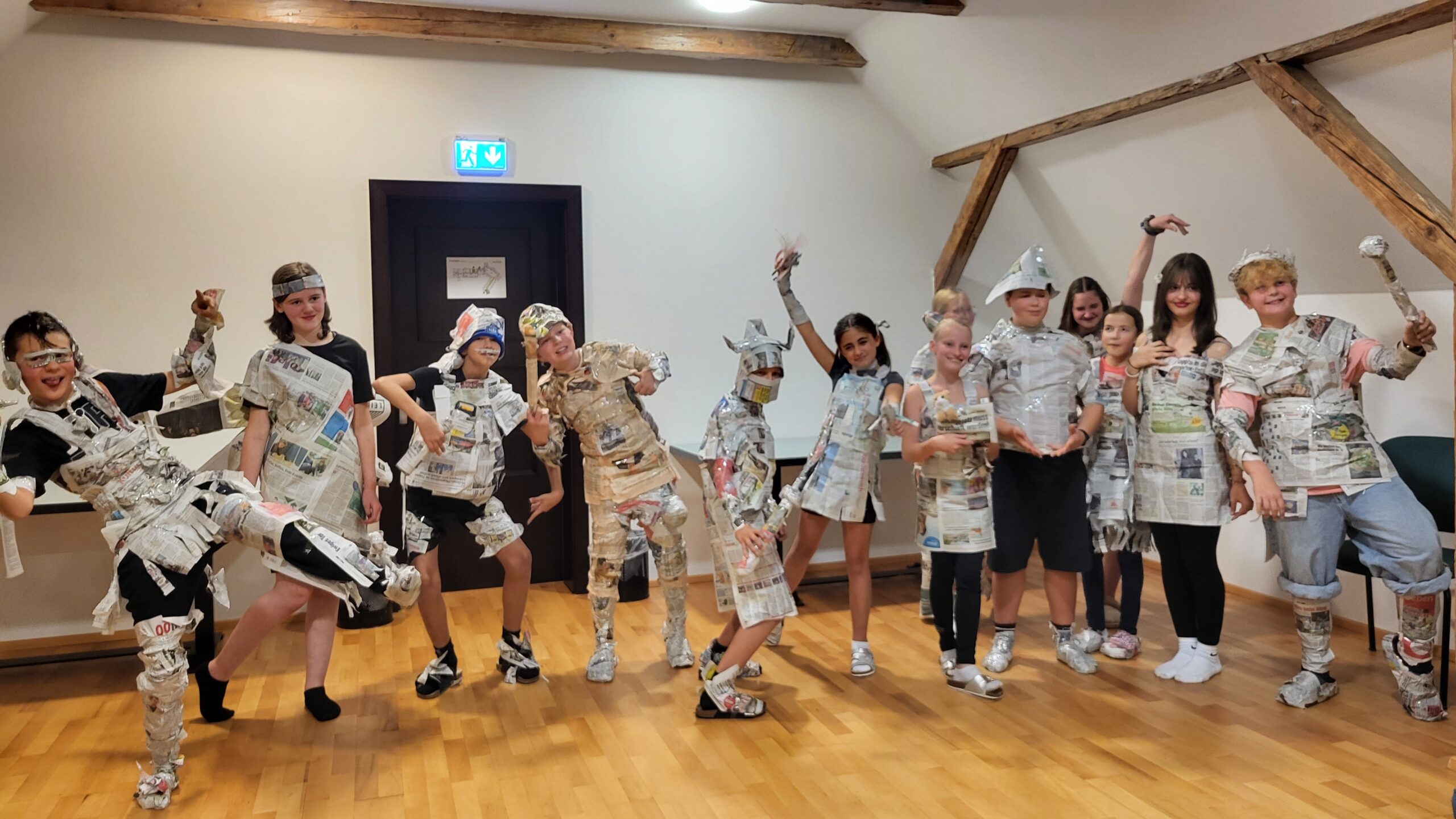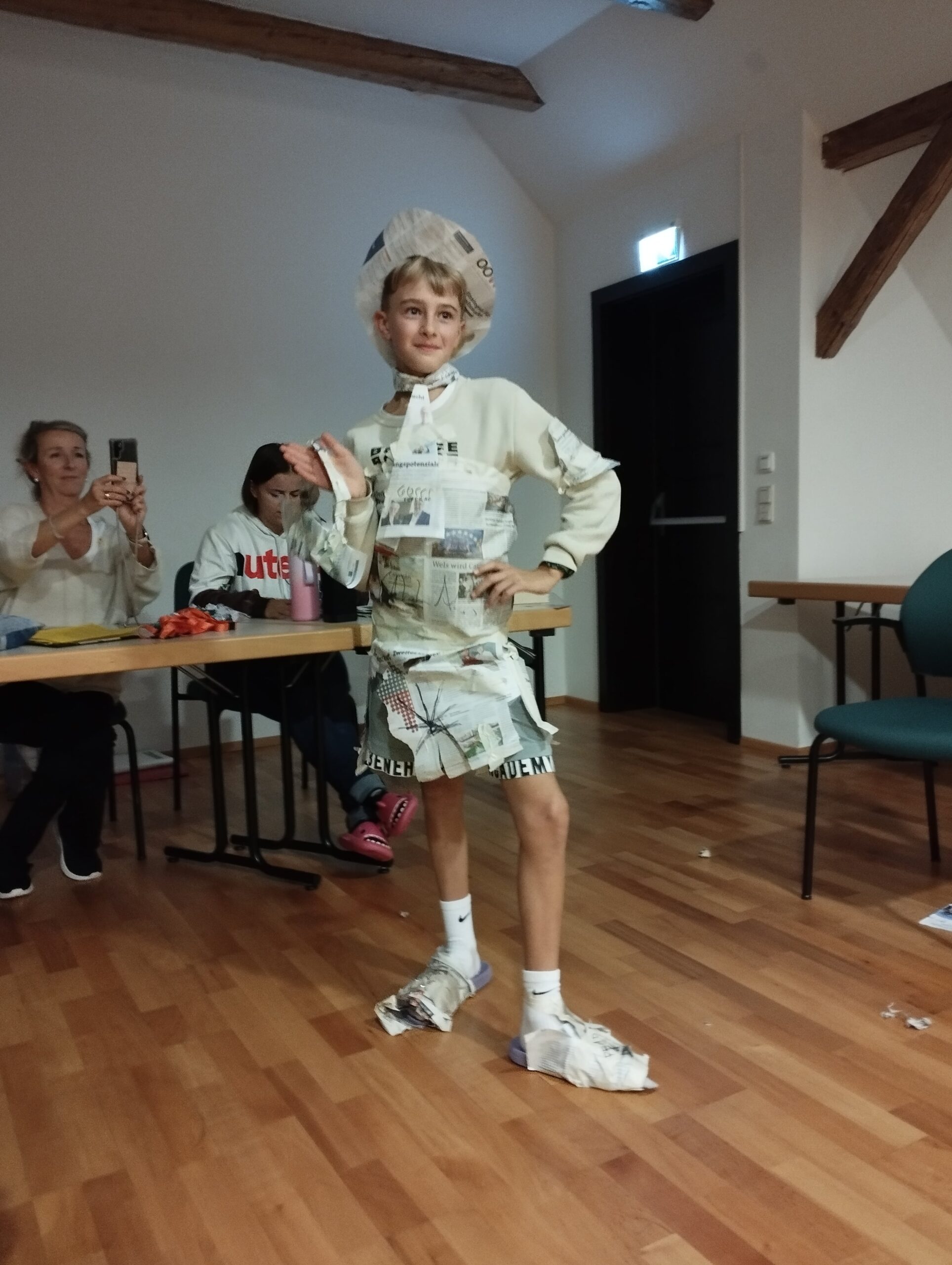 Kreativität durfte ebenfalls nicht fehlen. Beim bunten Abend gestalteten die Kinder fantasievolle Kostüme aus Zeitungspapier. Höhepunkt war eine lustige Modeschau – tolle Ergebnisse und jede Menge Jubel garantiert!