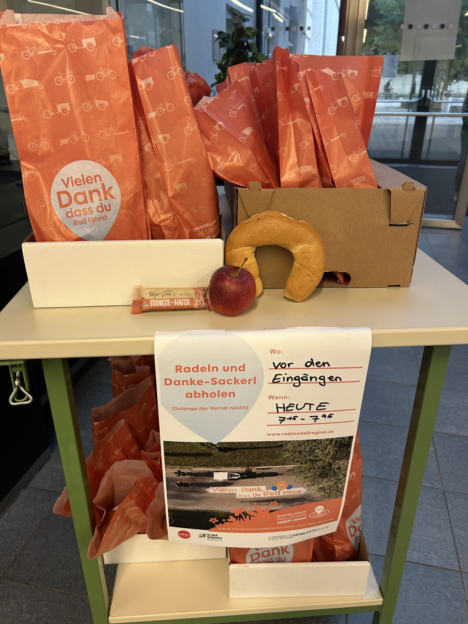 Jede und jeder erhielt am Morgen des 16. September ein zusammengestelltes Frühstückssackerl: Darin befanden sich ein Kipferl von einer regionalen Bäckerei, ein Bio-Müsliriegel sowie leckere Bio-Äpfel vom Obsthof Wiesmeier.