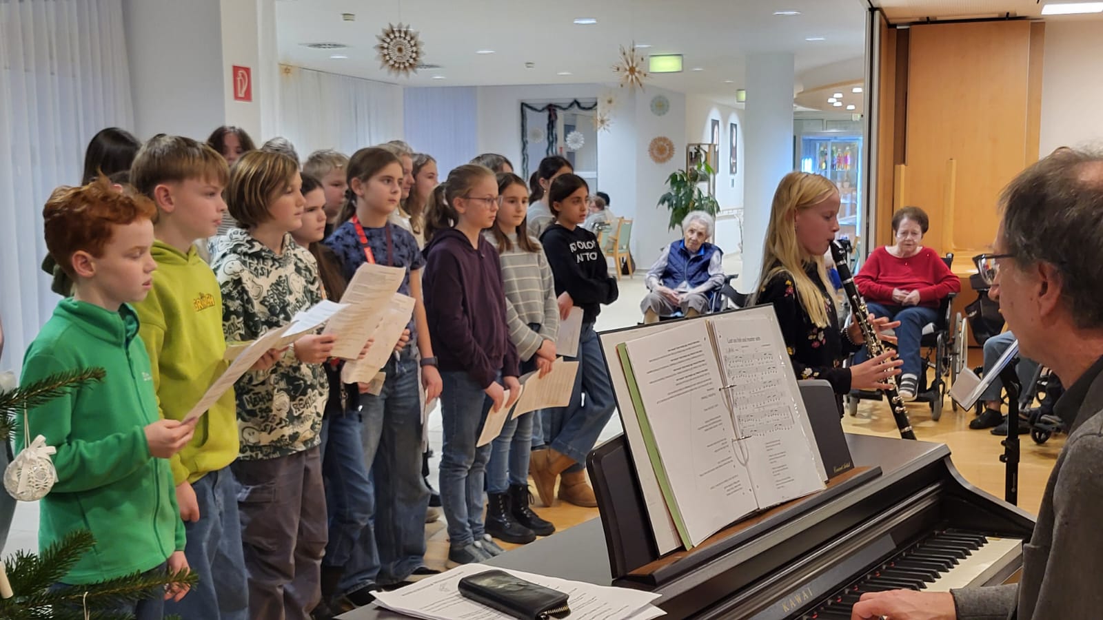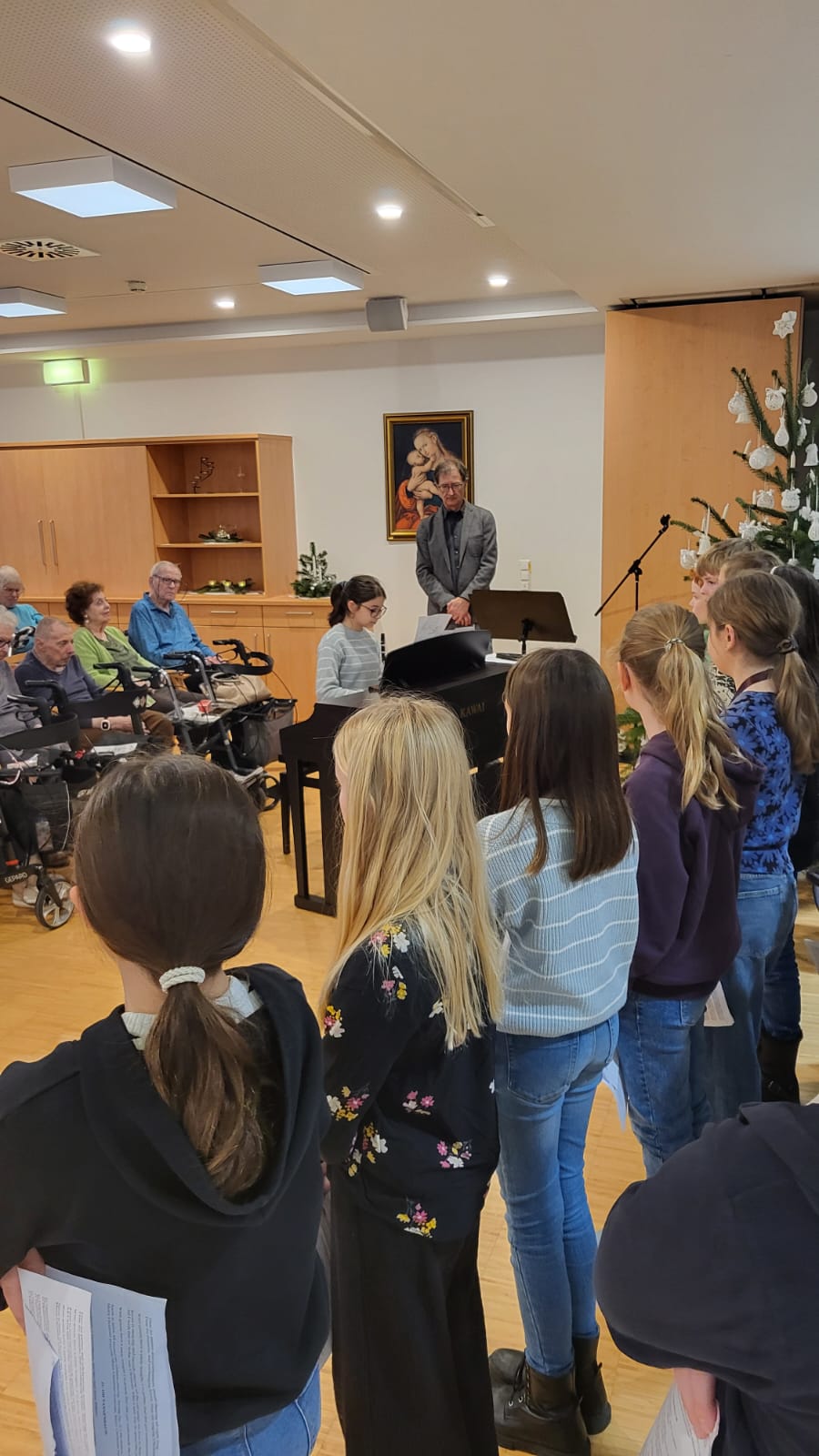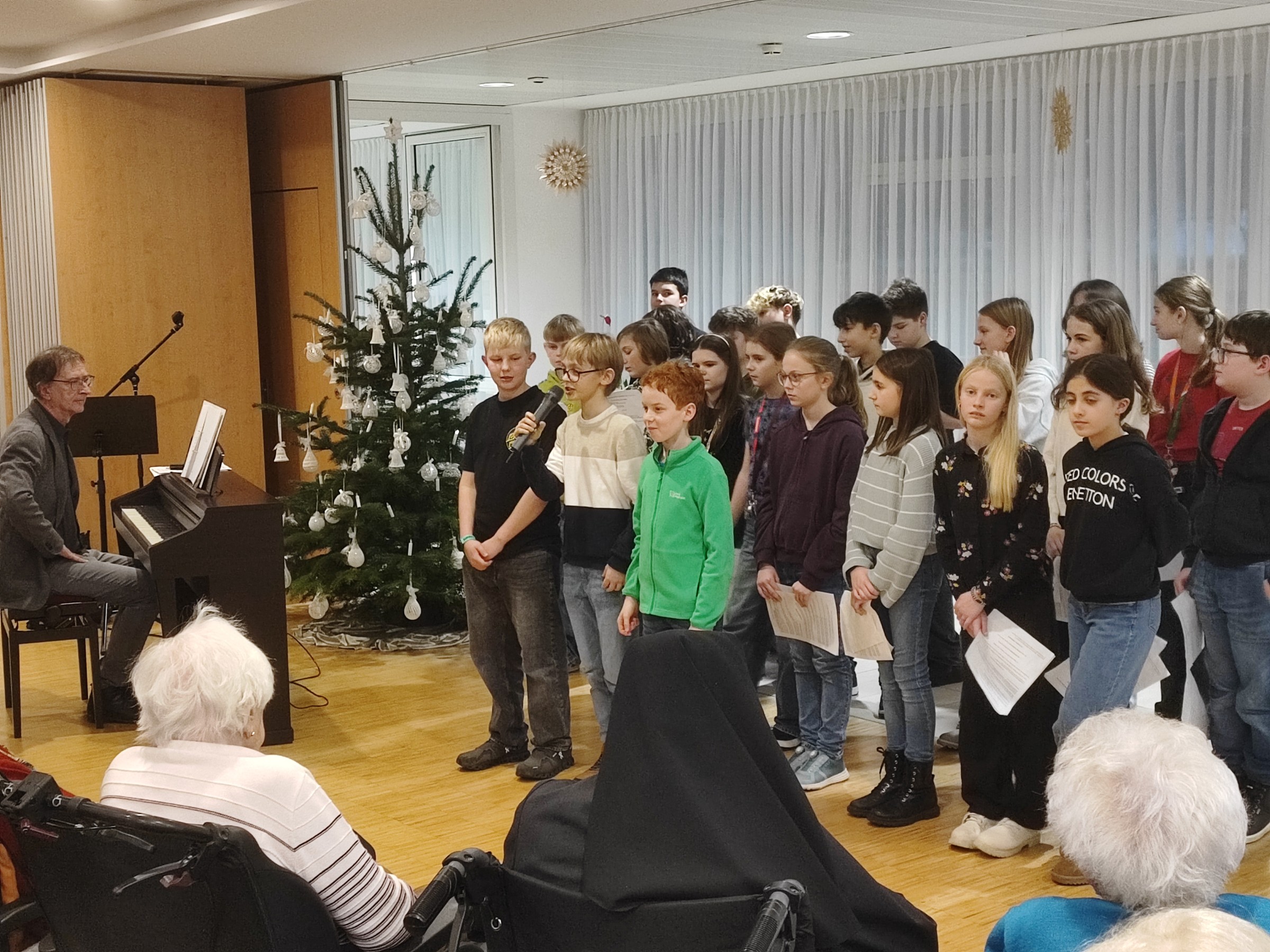 Dieses Jahr hatte sich die 2B auf den Besuch vorbereitet, von Prof. Martin Neudorfer wurde ein vielfältiges Programm zusammengestellt, das in den Wochen davor intensiv geprobt wurde. Am Nachmittag des 12. Dezember machte sich die Klasse zusammen mit Prof. Neudorfer und den Klassenvorständen Prof. Igelsböck und Prof. Feindert auf den Weg zum Auftritt im Altenheim. Dort füllten die Musik und die Texte den Raum mit einer warmen und herzlichen Atmosphäre. Bei verschiedenen Weihnachtsliedklassikern wurde von manchen Bewohnerinnen und Bewohnern auch begeistert mitgesungen. Einzelne Personen konnten zudem ihre besonderen musikalischen Talente präsentieren, es war aber schön zu sehen, dass alle Schüler*innen sich am Auftritt beteiligten.