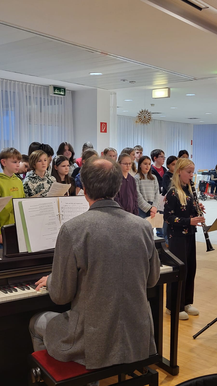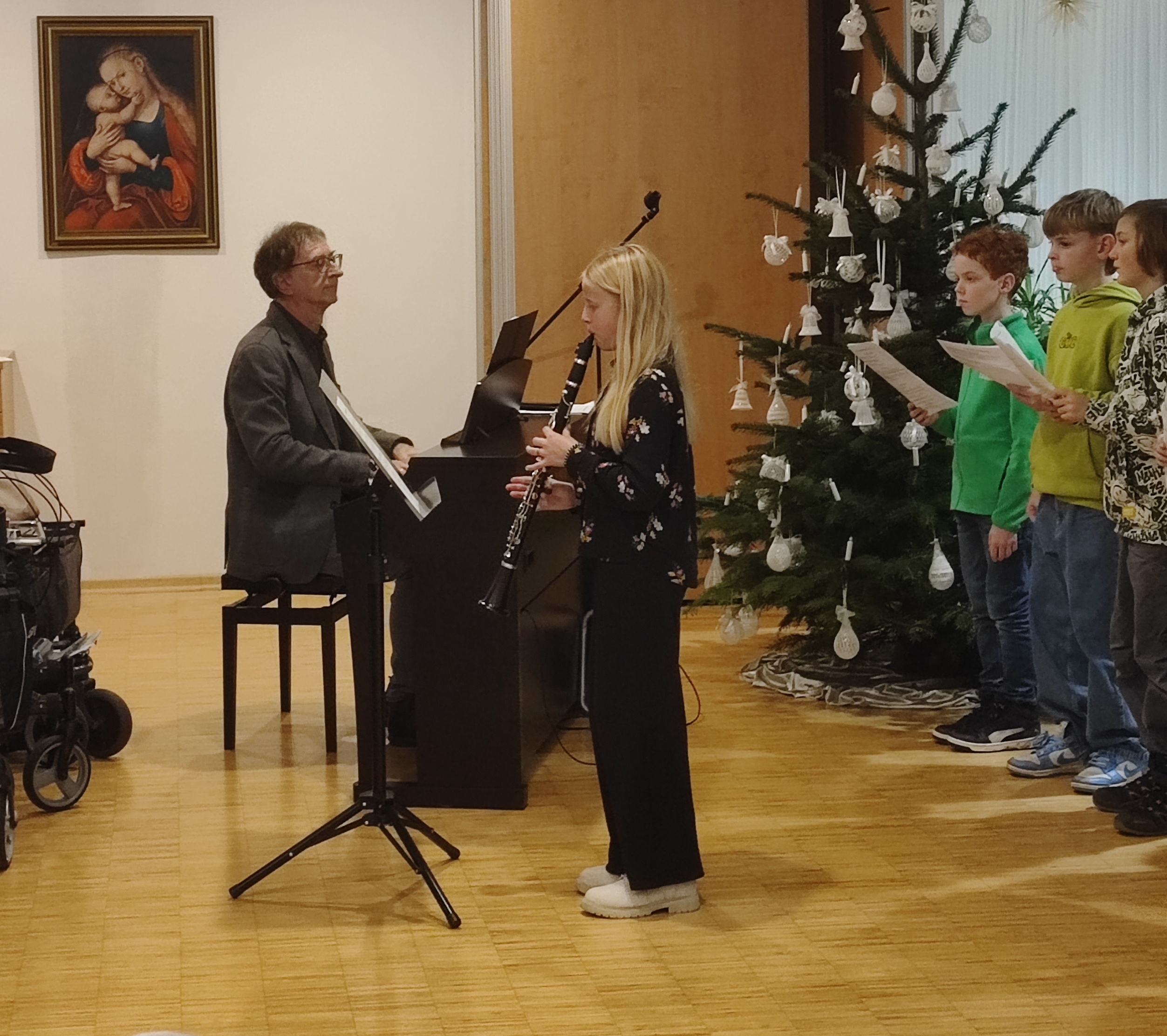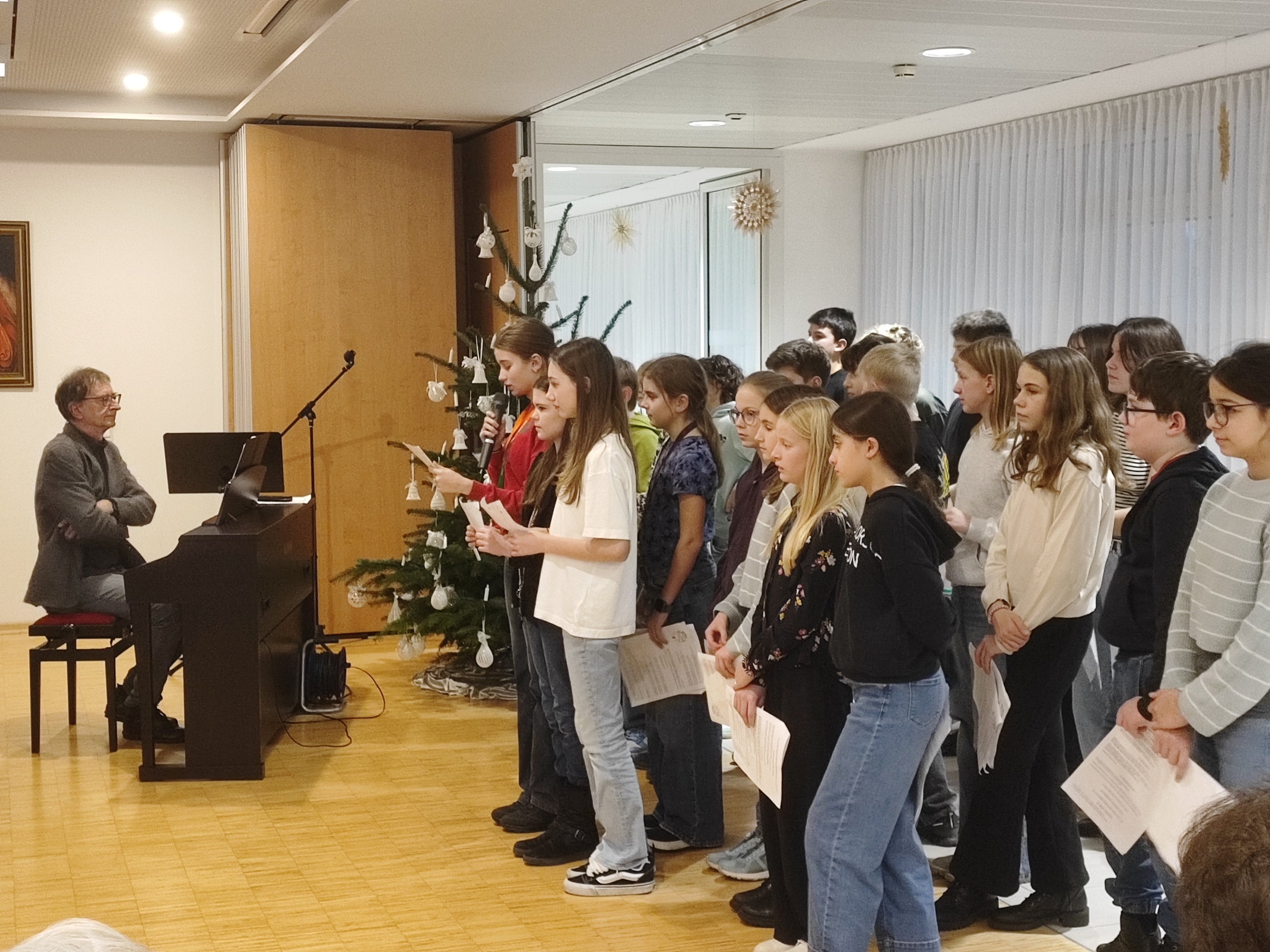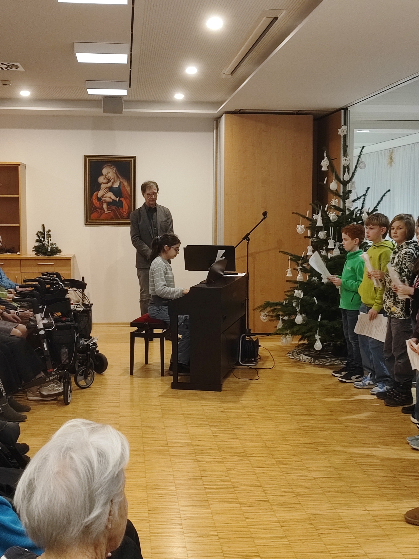 Dieses Jahr hatte sich die 2B auf den Besuch vorbereitet, von Prof. Martin Neudorfer wurde ein vielfältiges Programm zusammengestellt, das in den Wochen davor intensiv geprobt wurde. Am Nachmittag des 12. Dezember machte sich die Klasse zusammen mit Prof. Neudorfer und den Klassenvorständen Prof. Igelsböck und Prof. Feindert auf den Weg zum Auftritt im Altenheim. Dort füllten die Musik und die Texte den Raum mit einer warmen und herzlichen Atmosphäre. Bei verschiedenen Weihnachtsliedklassikern wurde von manchen Bewohnerinnen und Bewohnern auch begeistert mitgesungen. Einzelne Personen konnten zudem ihre besonderen musikalischen Talente präsentieren, es war aber schön zu sehen, dass alle Schüler*innen sich am Auftritt beteiligten.