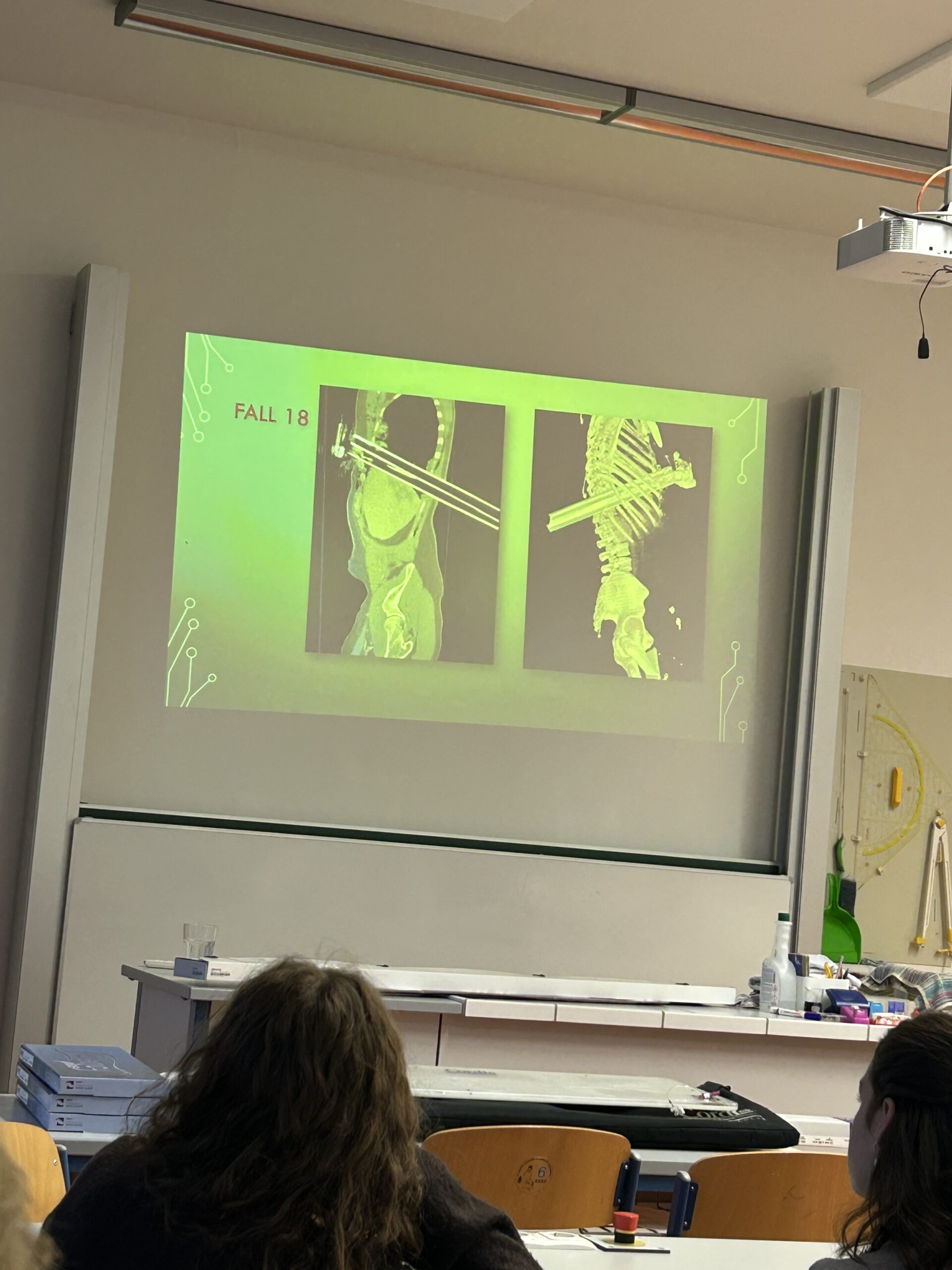 Die Schülerinnen und Schüler bekamen zudem exklusive Einblicke in hochmoderne medizinische Bildgebung. Dr. Priglinger präsentierte beeindruckende 3D-CT-Aufnahmen und MR-Bilder, die detaillierte Ansichten von medizinischen Zuständen wie einem Bandscheibenvorfall oder Knieproblemen zeigten. Ein weiteres Highlight des Vortrags war die Vorstellung von konkreten Fällen mit anschaulichen Bildern.