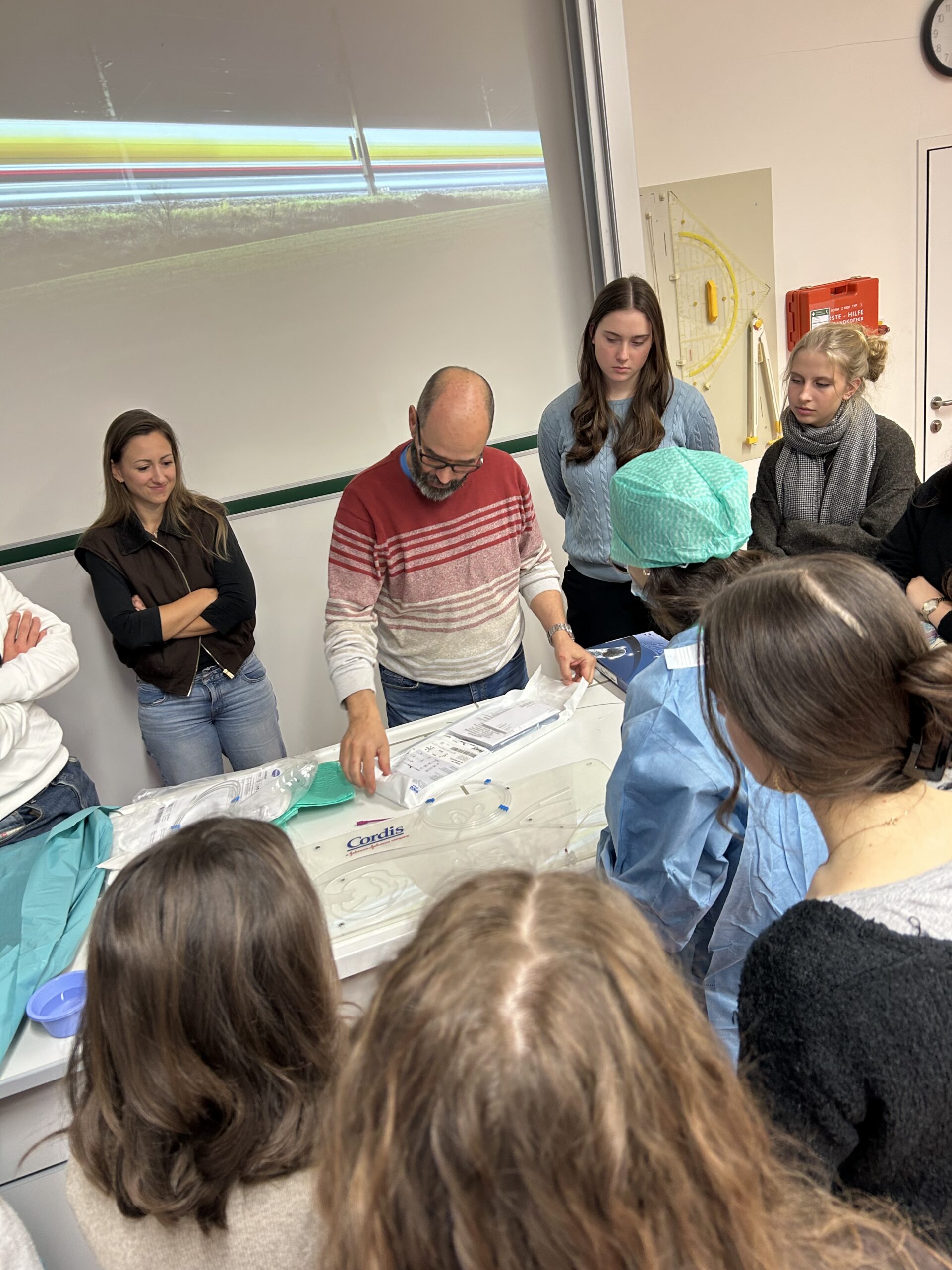 Zum Abschluss des Vortrags durften die Schüler:innen selbst Hand anlegen und an einem Modell einen Stent einsetzen – natürlich in vollständigem OP-Outfit! Damit konnten sie typische medizinische Interventionen direkt ausprobieren und ein besseres Gefühl für medizinische Eingriffe bekommen.