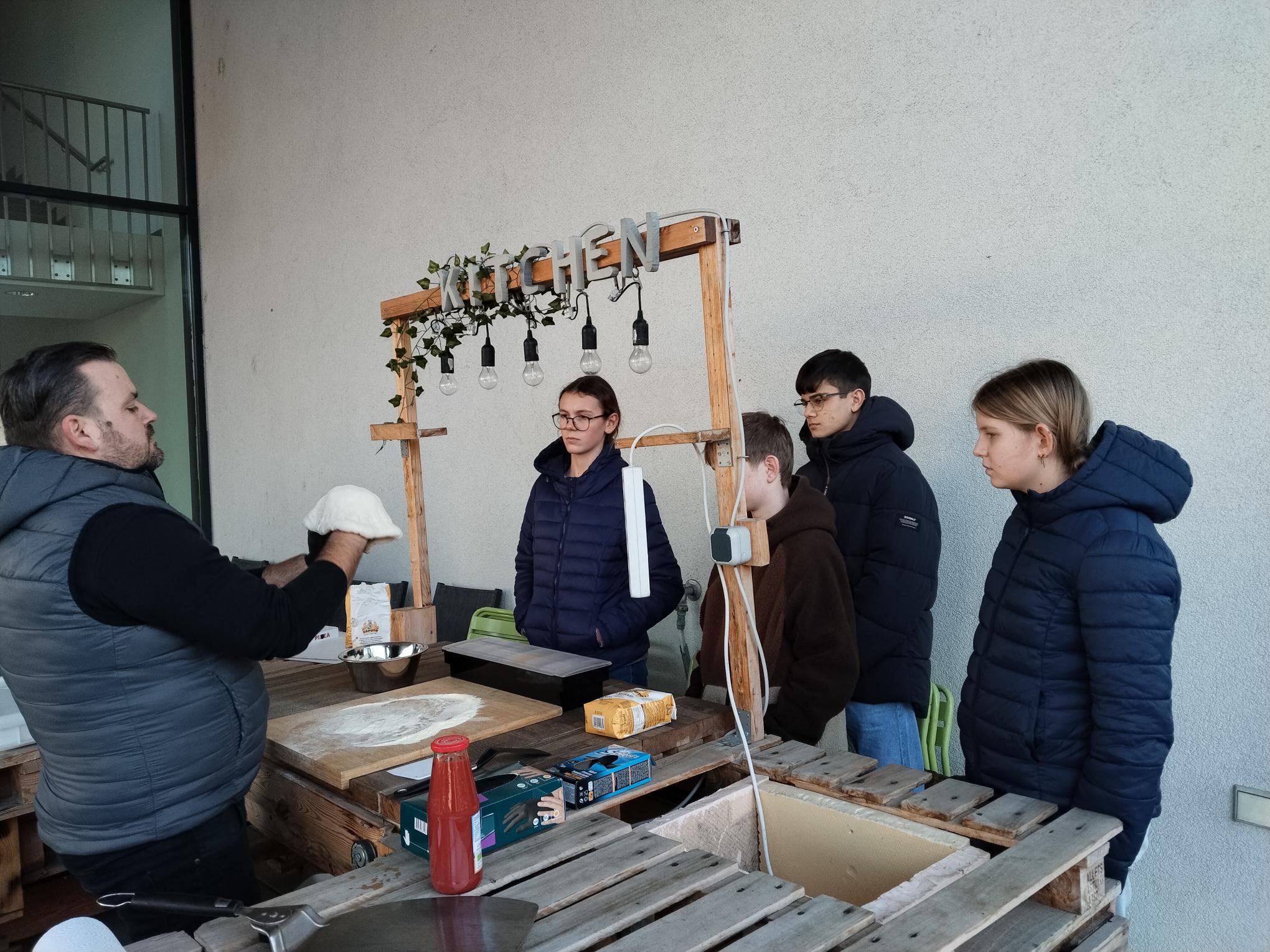 Herr Keppert, Vater einer Schülerin der 3A und leidenschaftlicher Hobbypizzabäcker und Griller, brachte einen Gaspizzaofen, das nötige Equipment und vorbereiteten Pizzateig mit – perfetto! Mit viel Freude und Begeisterung waren die Schüler*innen bei der Sache und lernten auch, wie man Pizzateig selbst herstellt – imparare facendo.