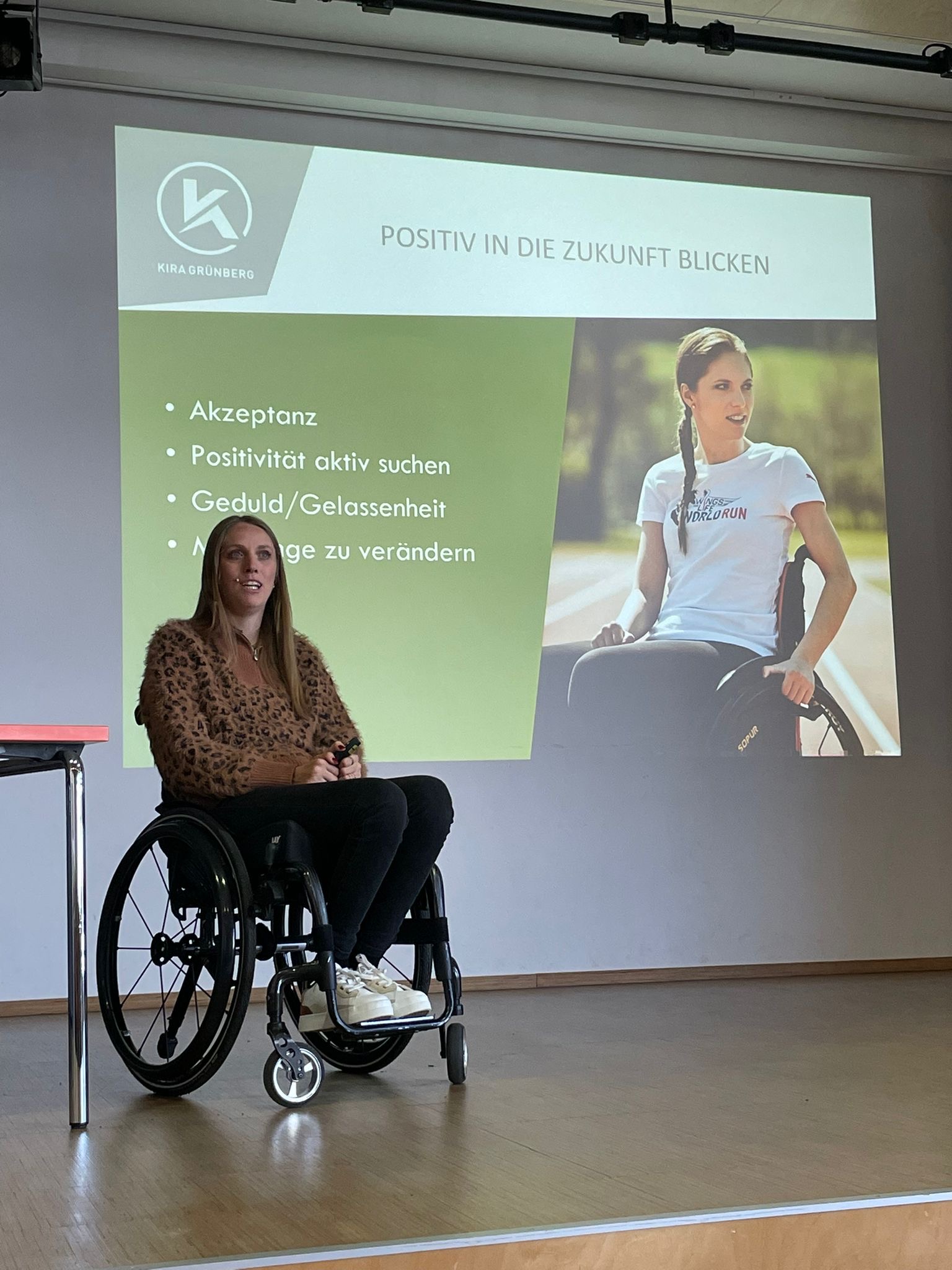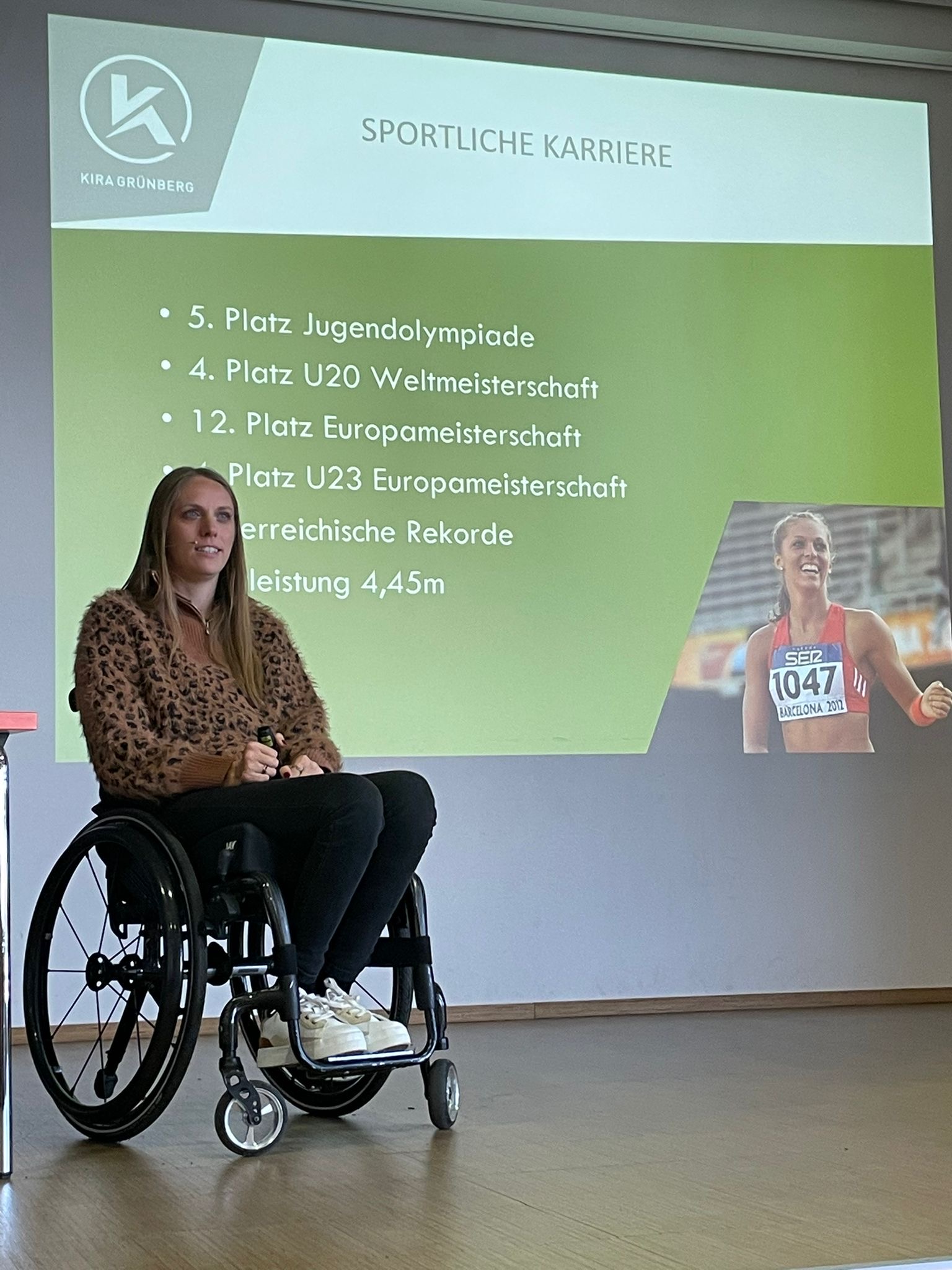 Kira Grünberg, ehemalige Leistungssportlerin im Stabhochsprung und seit einem Trainingsunfall querschnittgelähmt, besuchte unsere Schule und gab den OberstufenschülerInnen einen spannenden und beeindruckenden Einblick in ihr Leben vor und mit Querschnittlähmung. Trotz vieler Einschränkungen und Herausforderungen im Alltag meistert Frau Grünberg heute ihr Leben mit viel Freude, Mut und Optimismus, u. a. als Nationalratsabgeordnete im Parlament und Sprecherin für Menschen mit Behinderung.